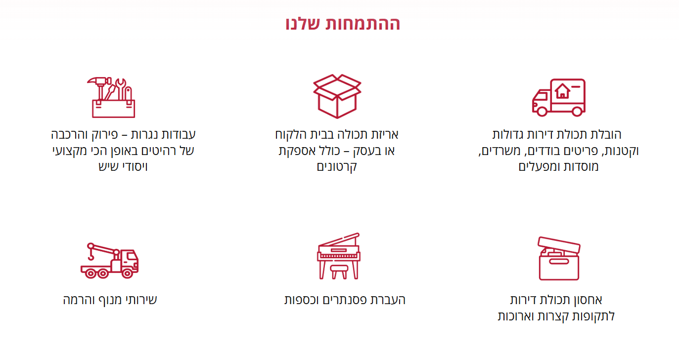 השירות כולל תכנון הובלה טעינה הגנה על רהיטים פריקה וסידור בסיסי לפי צורך. יש ביטוח מטען מלא לכל נסיעה.